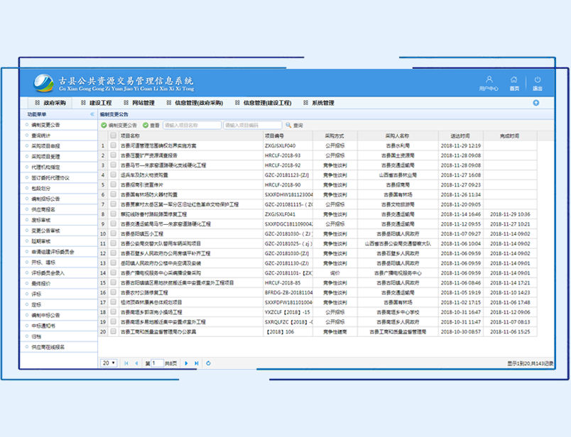 将公共资源交易过程中的各类信息资源进行有效的整合和集成,为交易各方提供一个协同工作的平台,实现工程建设、政府采购、土地使用权交易、国有产权出让交易、药品及医疗器械采购等活动的全过程网上电子交易。